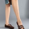 کفش تخت زنانه بازتونی با کمربند میخدار از جیر قهوهای تلخ، انتخابی مناسب برای بانوانی است که به دنبال راحتی و زیبایی در یک کالای کاربردی هستند. این کفش با طراحی شیک و مدرن، به راحتی با انواع لباسها ست میشود.