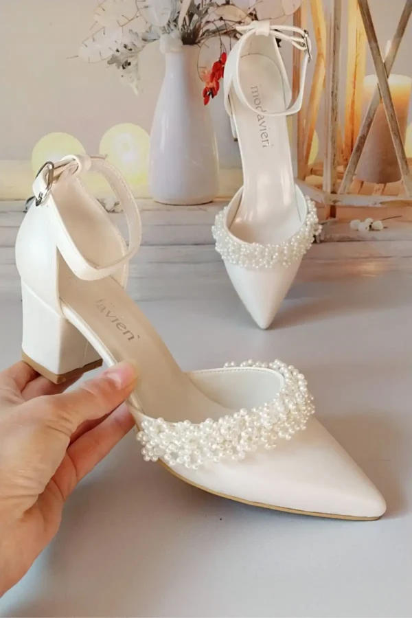 کفش پاشنه بلند زنانه عروس با طراحی زیبا و منحصر به فرد، انتخابی ایدهآل برای عروسها در روز جشن عروسی است. این کفش با پاشنه 5 سانتی متری و صدفی مرواریدی، جلوهای خاص به پاهای شما میبخشد.